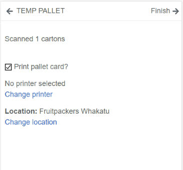 Print pallet card?- if you don't want to print a temp pallet card, untick this. The temporary pallet has a different format to a final pallet.Printer- your default printer, change if required.Location- your default location, change if required.